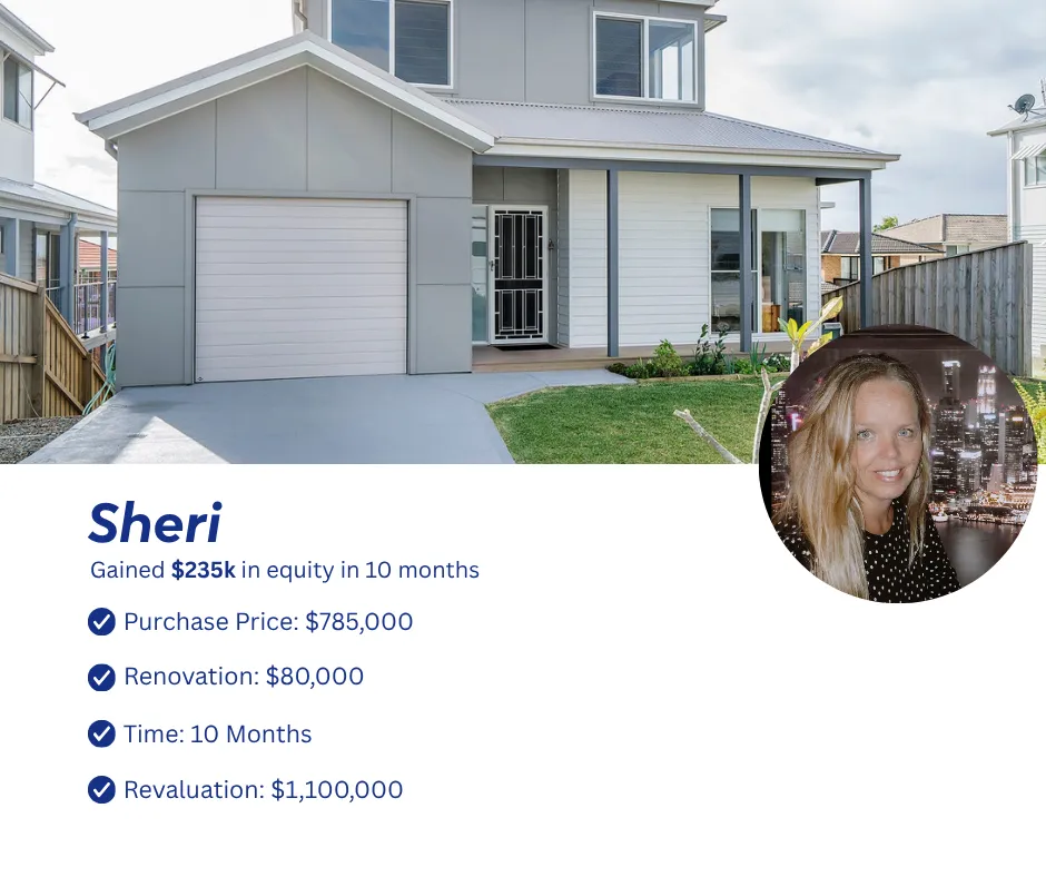 Real case studies — like Sarah & Nick who turned a $50K reno into $150K equity in 6 months, and Sheri who added $235K in 10 Months.